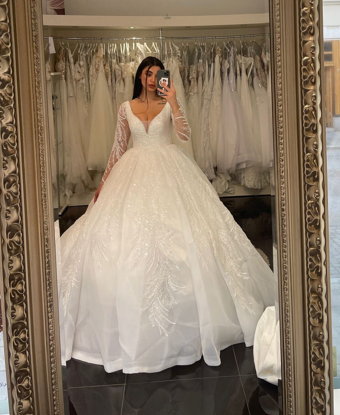 Denna majestätiska klänning fångar blicken med sitt gnistrande yttre, vars glittrande detaljer kastar vackra reflexer av ljus och skapar en förtrollande aura runt bruden. Varje steg framåt är som en dans på moln, med kjolen som sveper elegant omkring henne och för tankarna till en verklig prinsessa på väg mot sitt eget sagoslott.