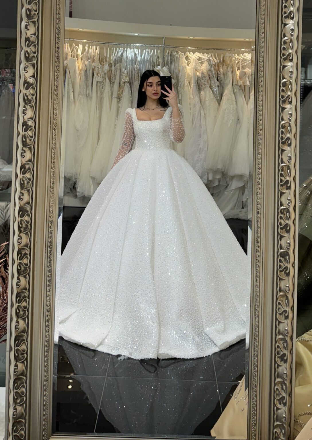 Denna majestätiska klänning fångar blicken med sitt gnistrande yttre, vars glittrande detaljer kastar vackra reflexer av ljus och skapar en förtrollande aura runt bruden. Varje steg framåt är som en dans på moln, med kjolen som sveper elegant omkring henne och för tankarna till en verklig prinsessa på väg mot sitt eget sagoslott.