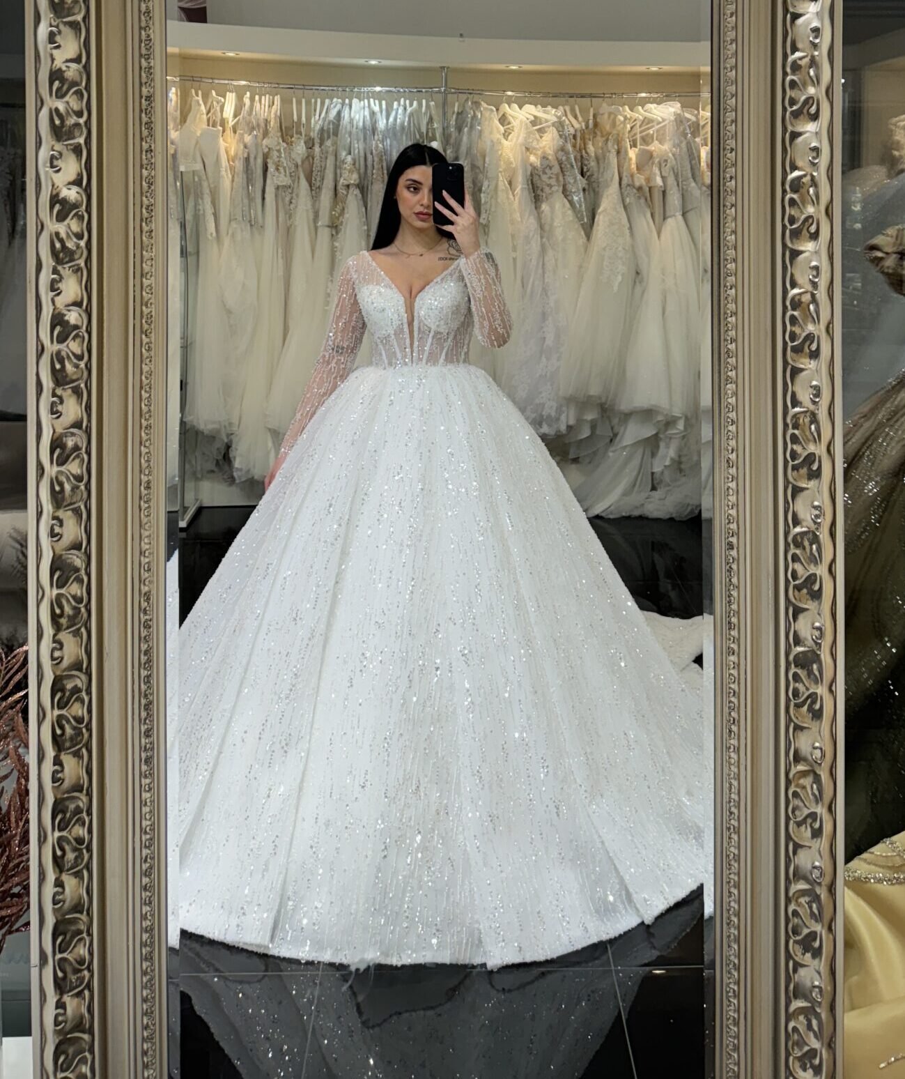 Denna majestätiska klänning fångar blicken med sitt gnistrande yttre, vars glittrande detaljer kastar vackra reflexer av ljus och skapar en förtrollande aura runt bruden. Varje steg framåt är som en dans på moln, med kjolen som sveper elegant omkring henne och för tankarna till en verklig prinsessa på väg mot sitt eget sagoslott.
