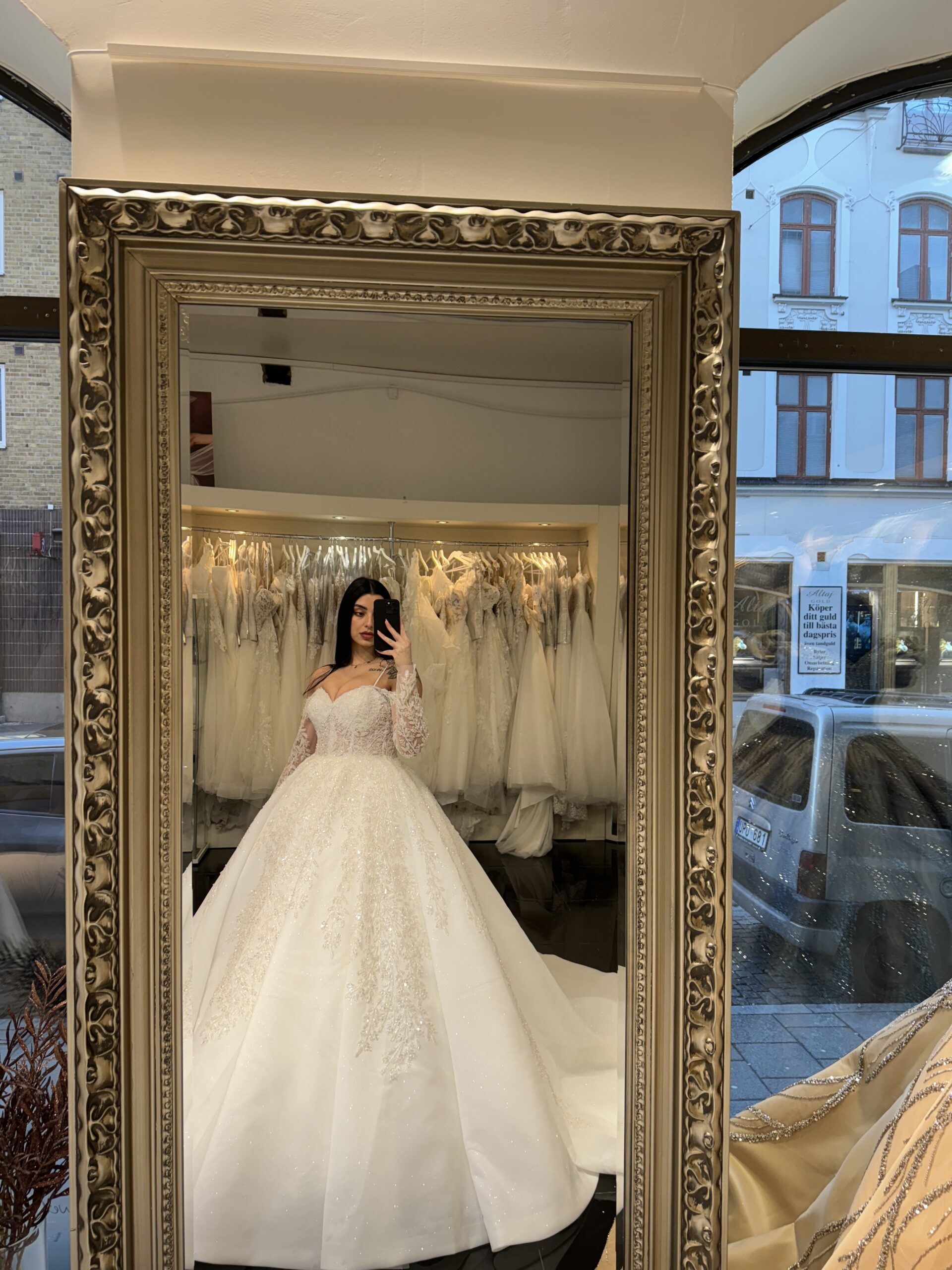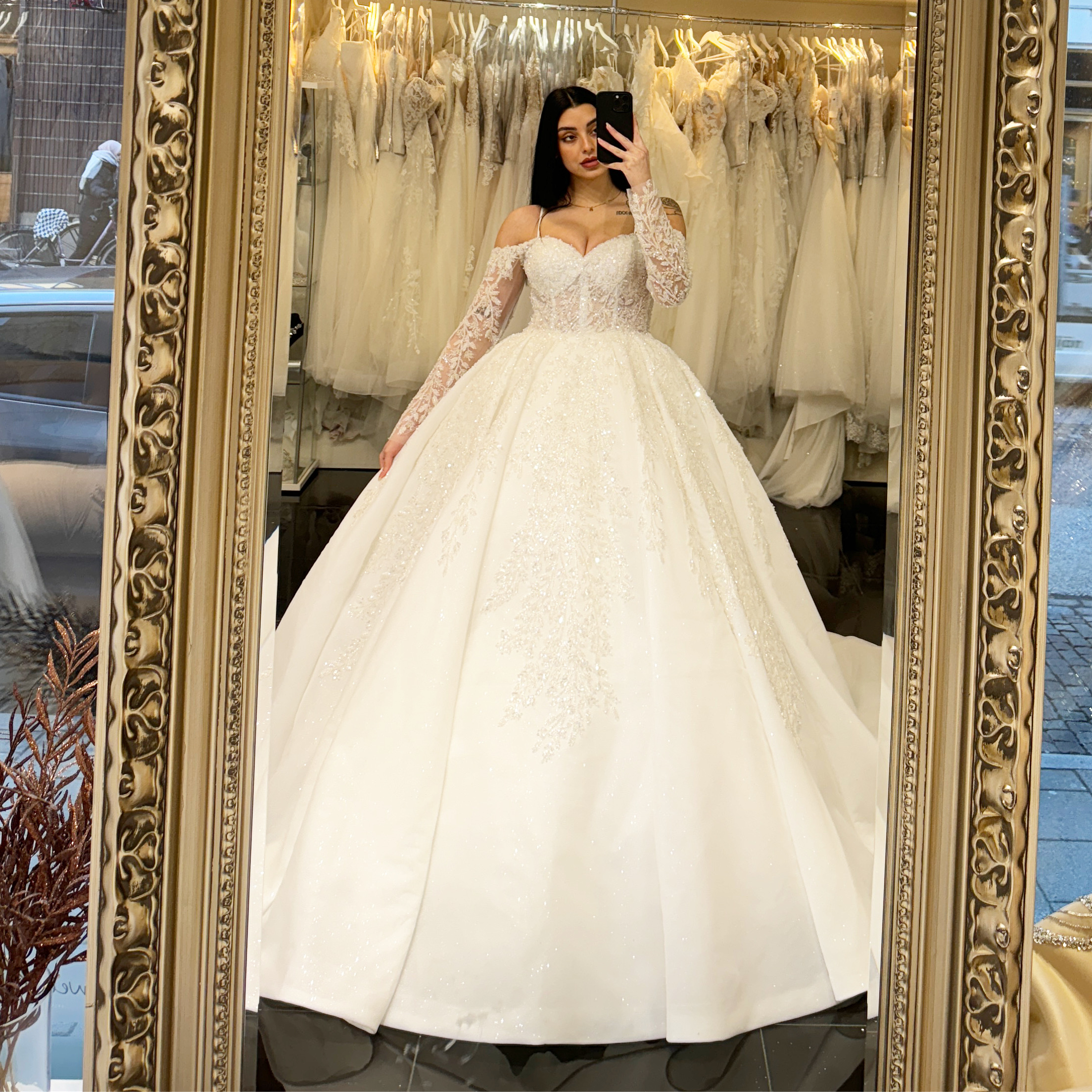 Denna majestätiska klänning fångar blicken med sitt gnistrande yttre, vars glittrande detaljer kastar vackra reflexer av ljus och skapar en förtrollande aura runt bruden. Varje steg framåt är som en dans på moln, med kjolen som sveper elegant omkring henne och för tankarna till en verklig prinsessa på väg mot sitt eget sagoslott.
