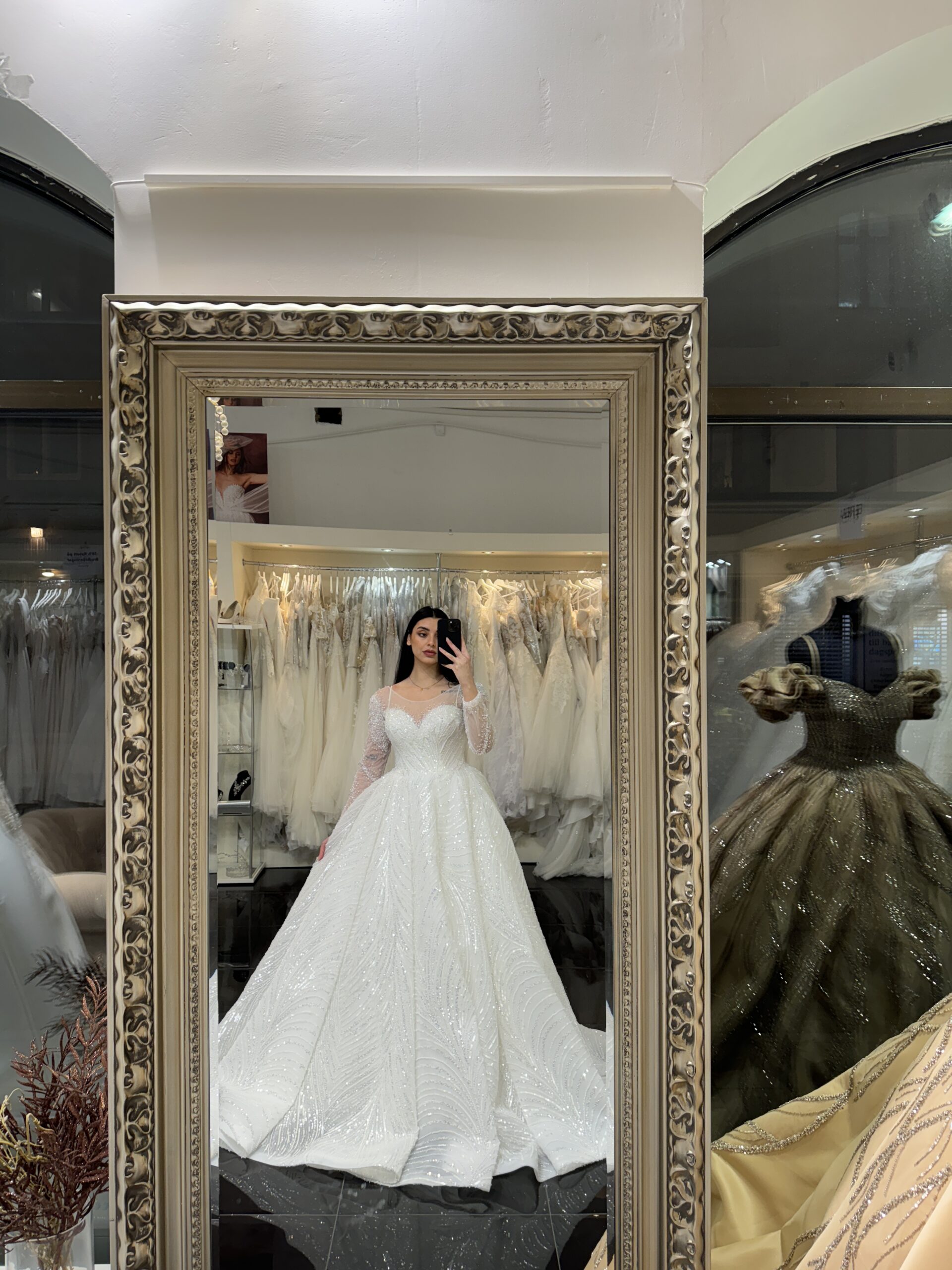 Denna majestätiska klänning fångar blicken med sitt gnistrande yttre, vars glittrande detaljer kastar vackra reflexer av ljus och skapar en förtrollande aura runt bruden. Varje steg framåt är som en dans på moln, med kjolen som sveper elegant omkring henne och för tankarna till en verklig prinsessa på väg mot sitt eget sagoslott.