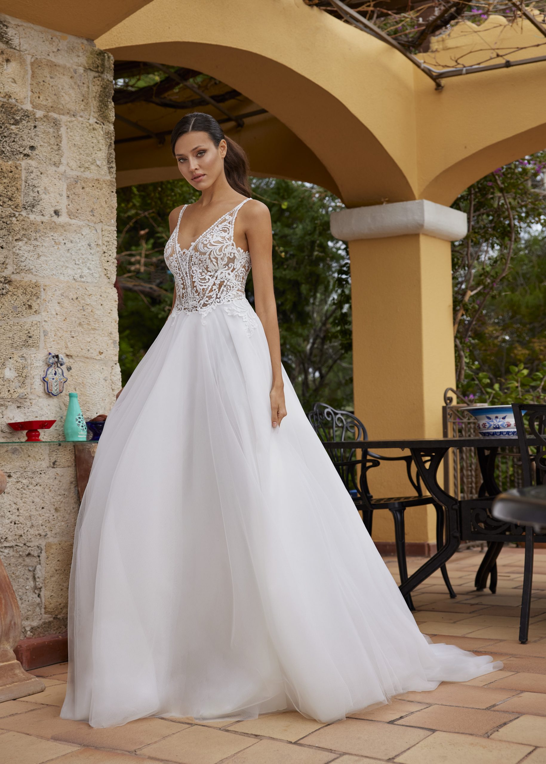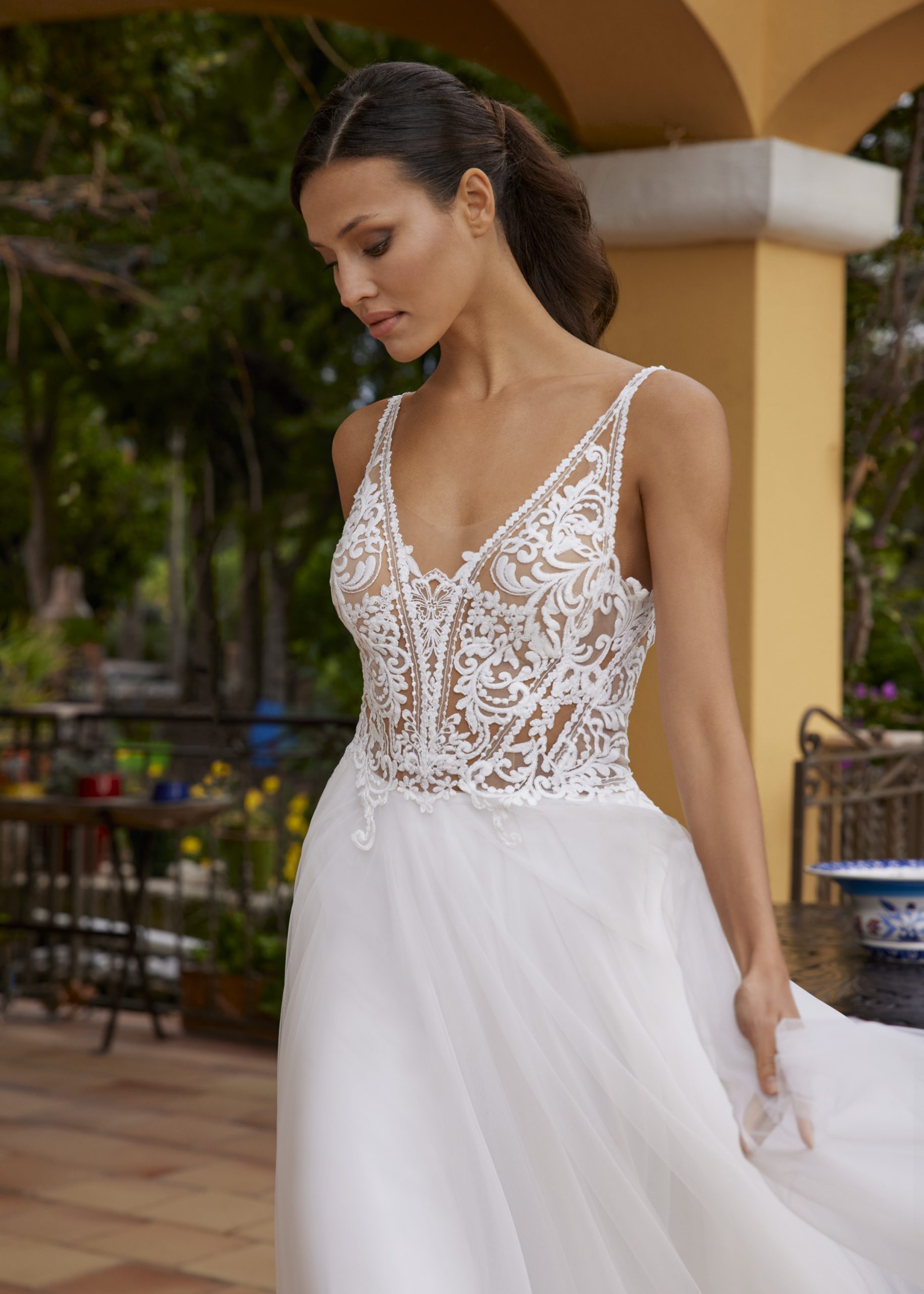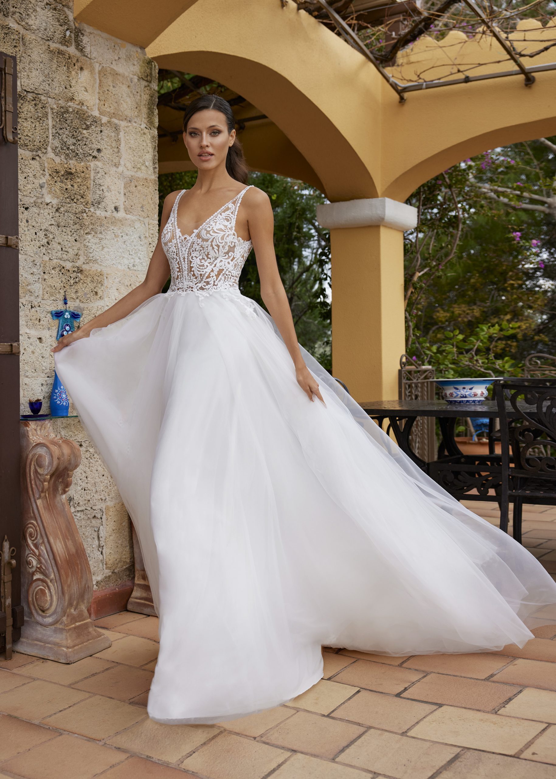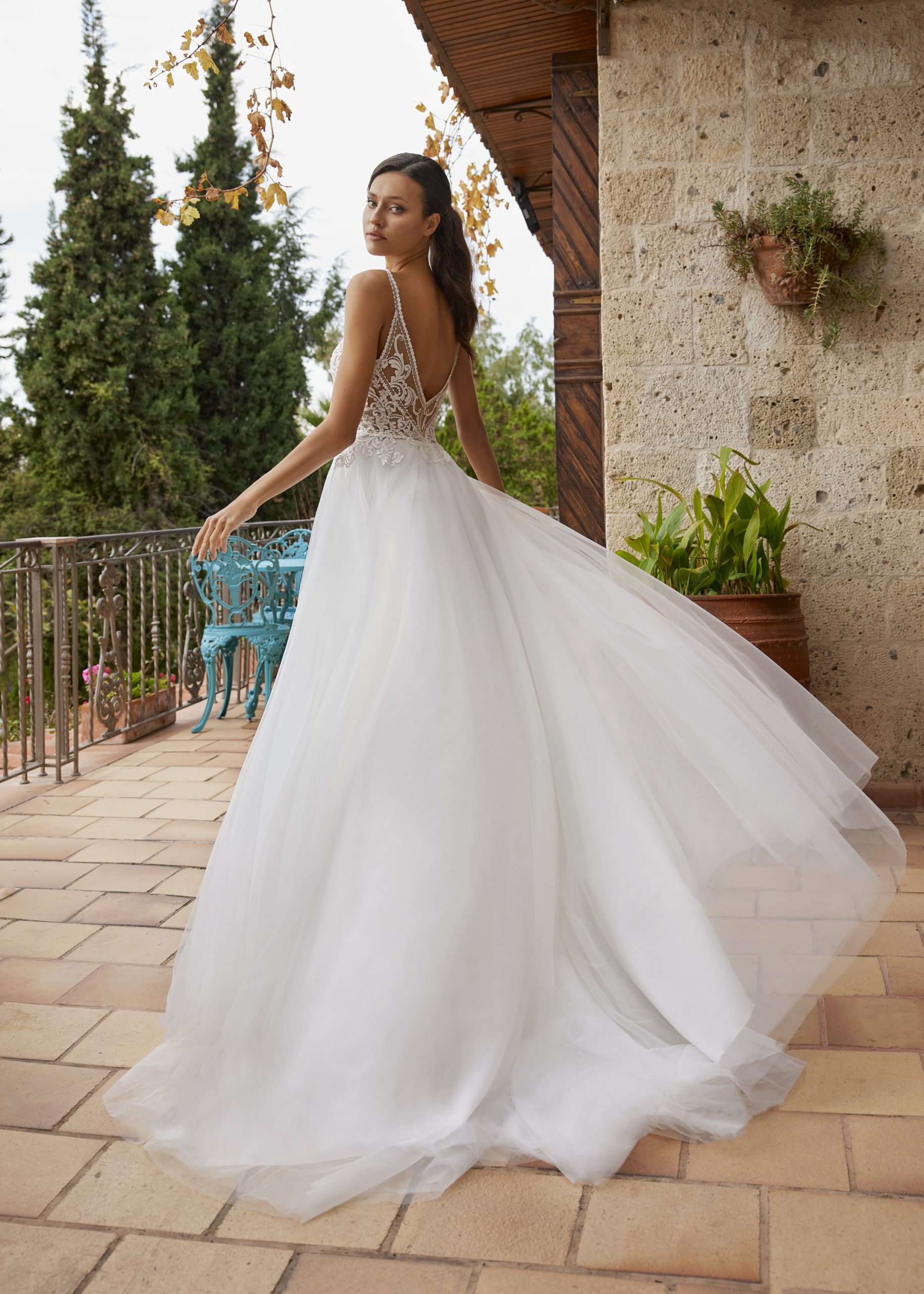 Kollektionen består av tyger som tyll, fransk spets, crepe och chiffong. Självklart ser du även fina brodyrer med paljetter för att ge klänningen en speciell glans. För det första skapas äkta vintage former med en fin snörning, som kompletteras med djup V-formad skurning och djup i ryggen. Dessutom gör det pricken över iet i dessa skapelser av design med fransar.