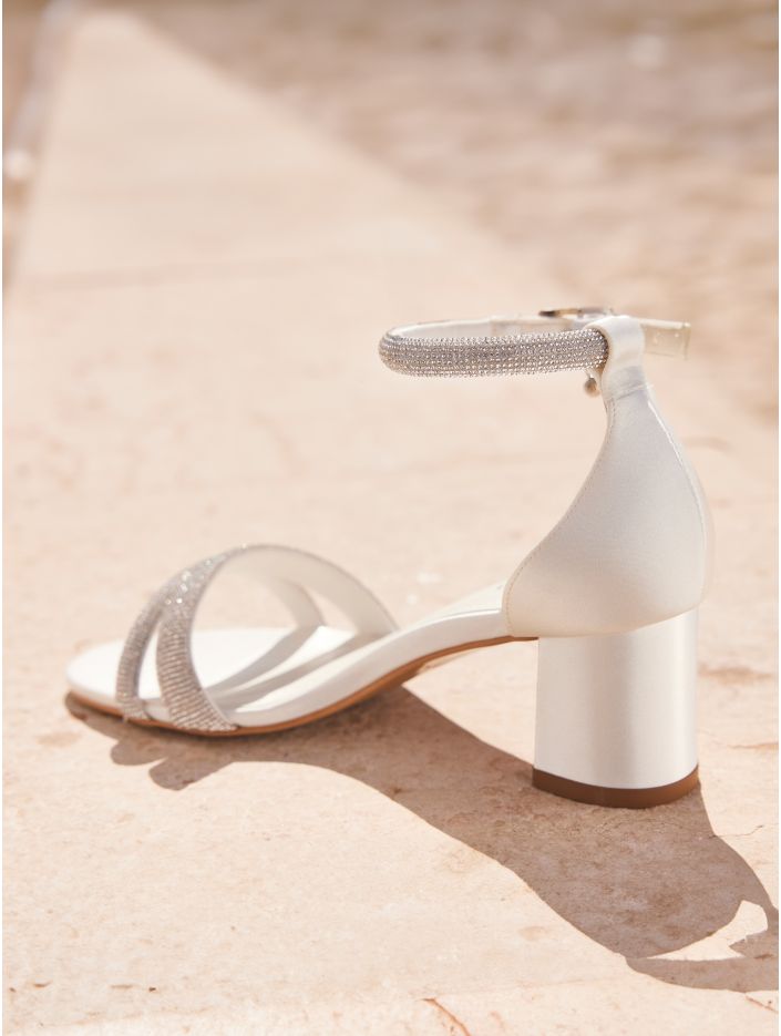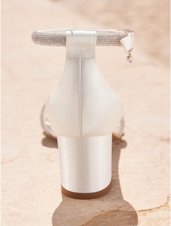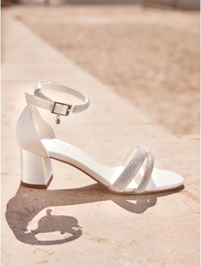 Eleganta sandaler i högkvalitativ satin med en stabil 6 cm hög blockklack. Skorna är prydda med silverdetaljer och glittrande cirkoner, har justerbara remmar för perfekt passform samt en mjuk skuminnersula för extra komfort. Omsorgsfullt designade i EU och tillverkade i Avalia egen produktionsanläggning.