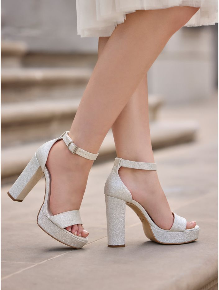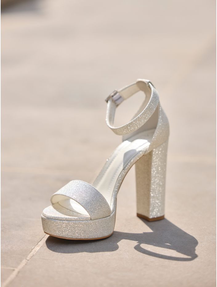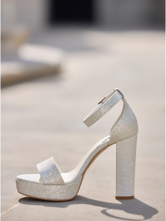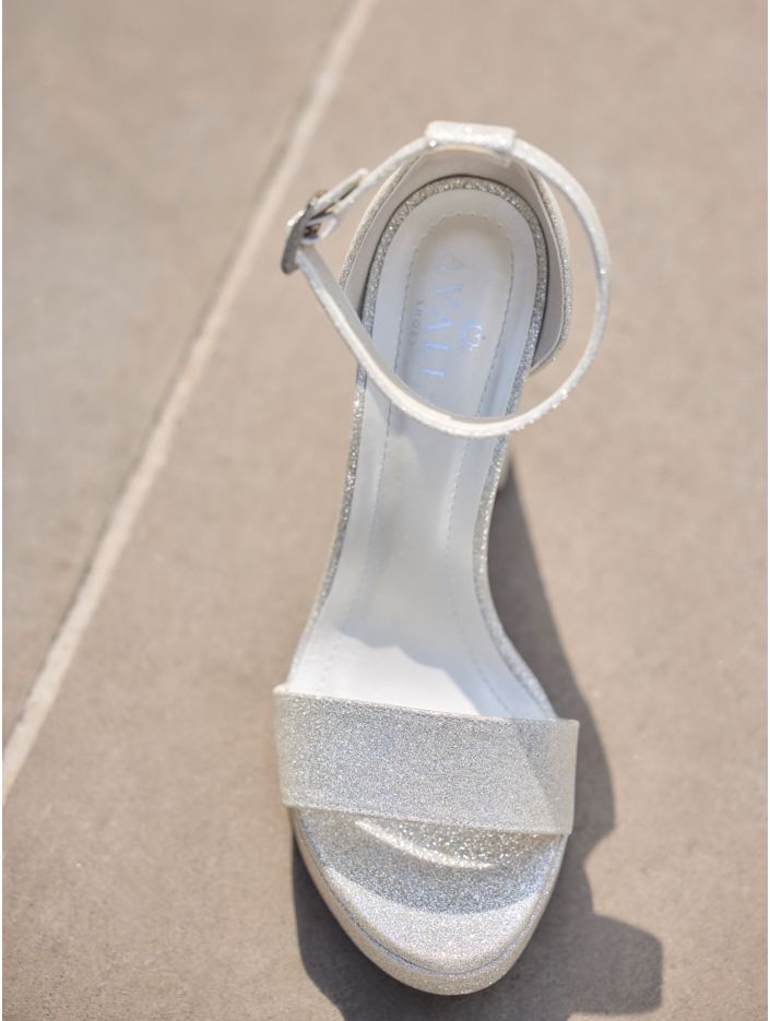 Brudsandaler i syntetmaterial som kombinerar stil och komfort. Skorna är prydda med glitterdetaljer, har en bred 12 cm hög klack och en 2,5 cm hög platå framtill. Ett smalt spännband ger en perfekt passform och den mjuka skuminnersulan ger extra komfort. Alla skor är omsorgsfullt designade i EU och tillverkade i Avalias egen produktionsanläggning.