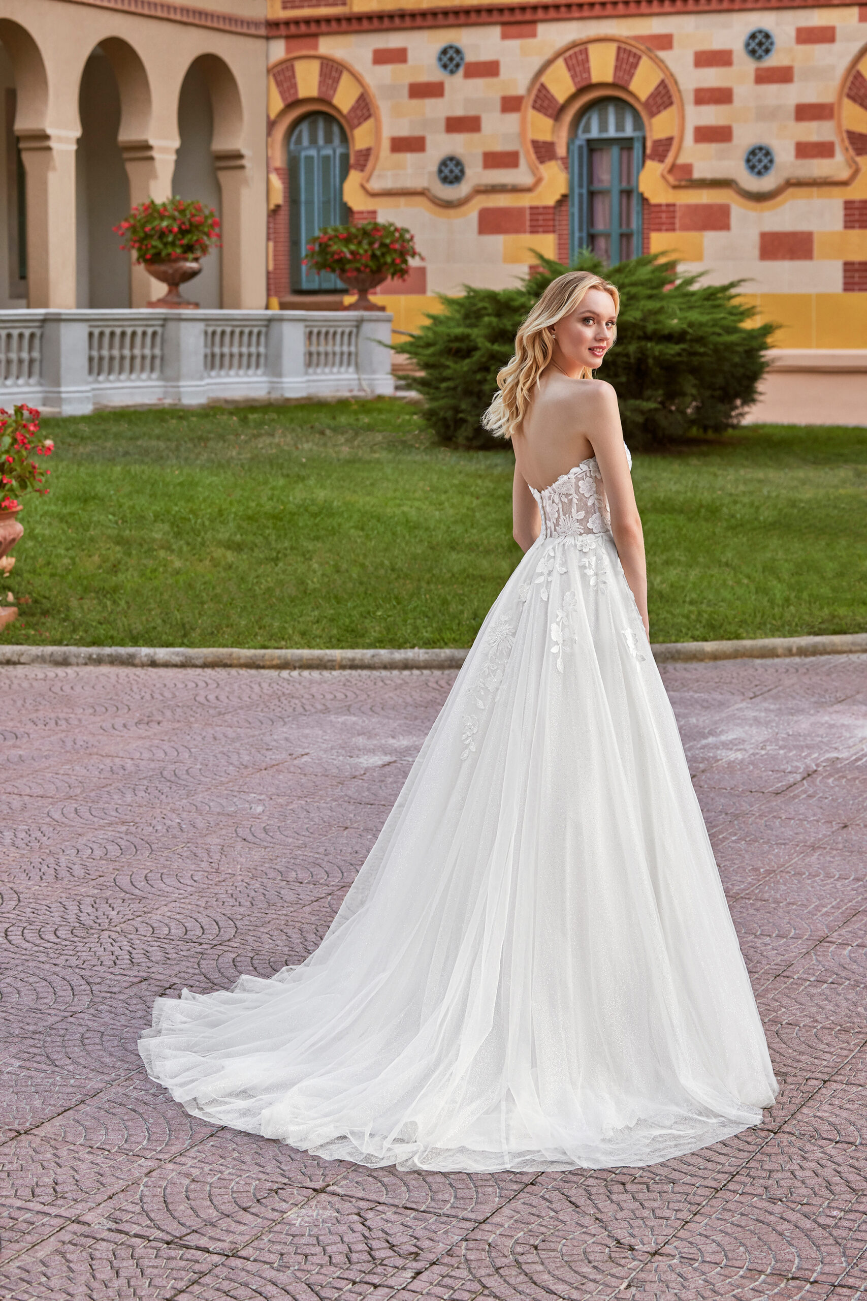 Brudklänning från Sweetheart – en drömmig axelbandslös prinsessklänning i glittertyll med transparent liv. Klänningen har en djup sweetheart-urringning och eleganta off shoulder-band. Livet är dekorerat med synliga skenor och vackra spetsapplikationer med paljetter som fortsätter ner över kjolen för en romantisk effekt. Baktill pryds klänningen av dekorativa glitterknappar och avslutas med ett svepande släp.